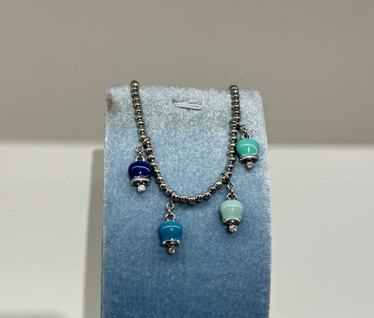 con quattro campanelline portafortuna impreziosite da smalto colorato, sui toni del blu e del celeste, e un diamantino al centro ad ognuna