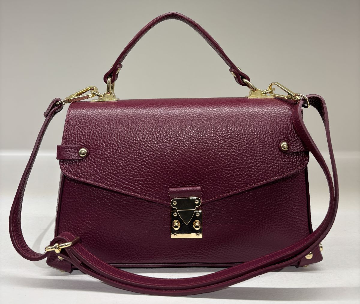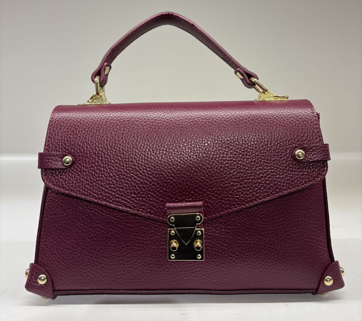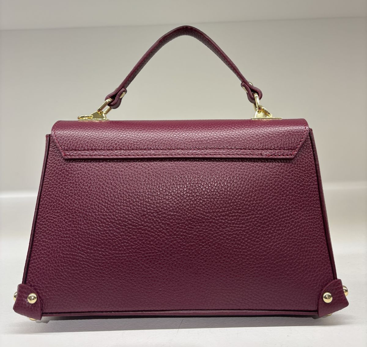 Borsa rigida bordeaux, 100% made in Italy. Presenta una chiusura metallica impreziosita da inserti dorati. All'interno è presente una tracolla regolabile ed una piccola tasca interna che la rendono pratica e funzionale. Alla base sono presenti dei piccoli chiodini che consentono alla borsa di non toccare le superfici.