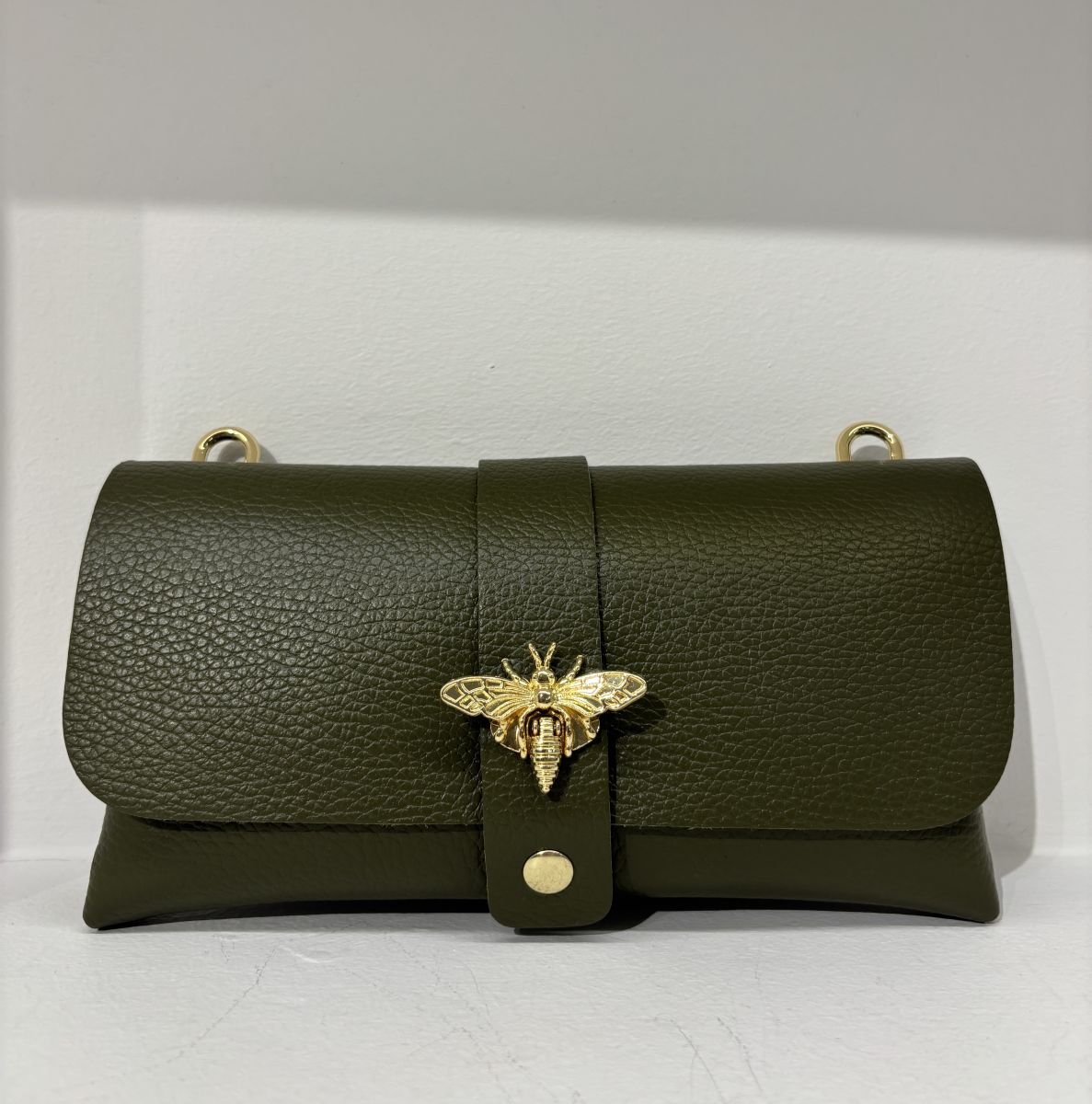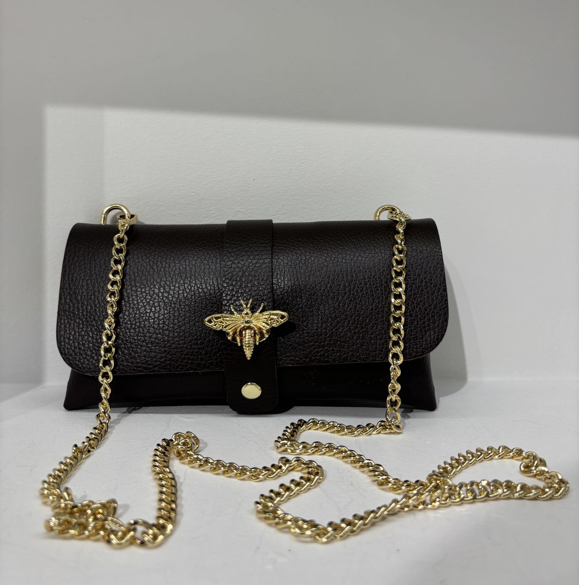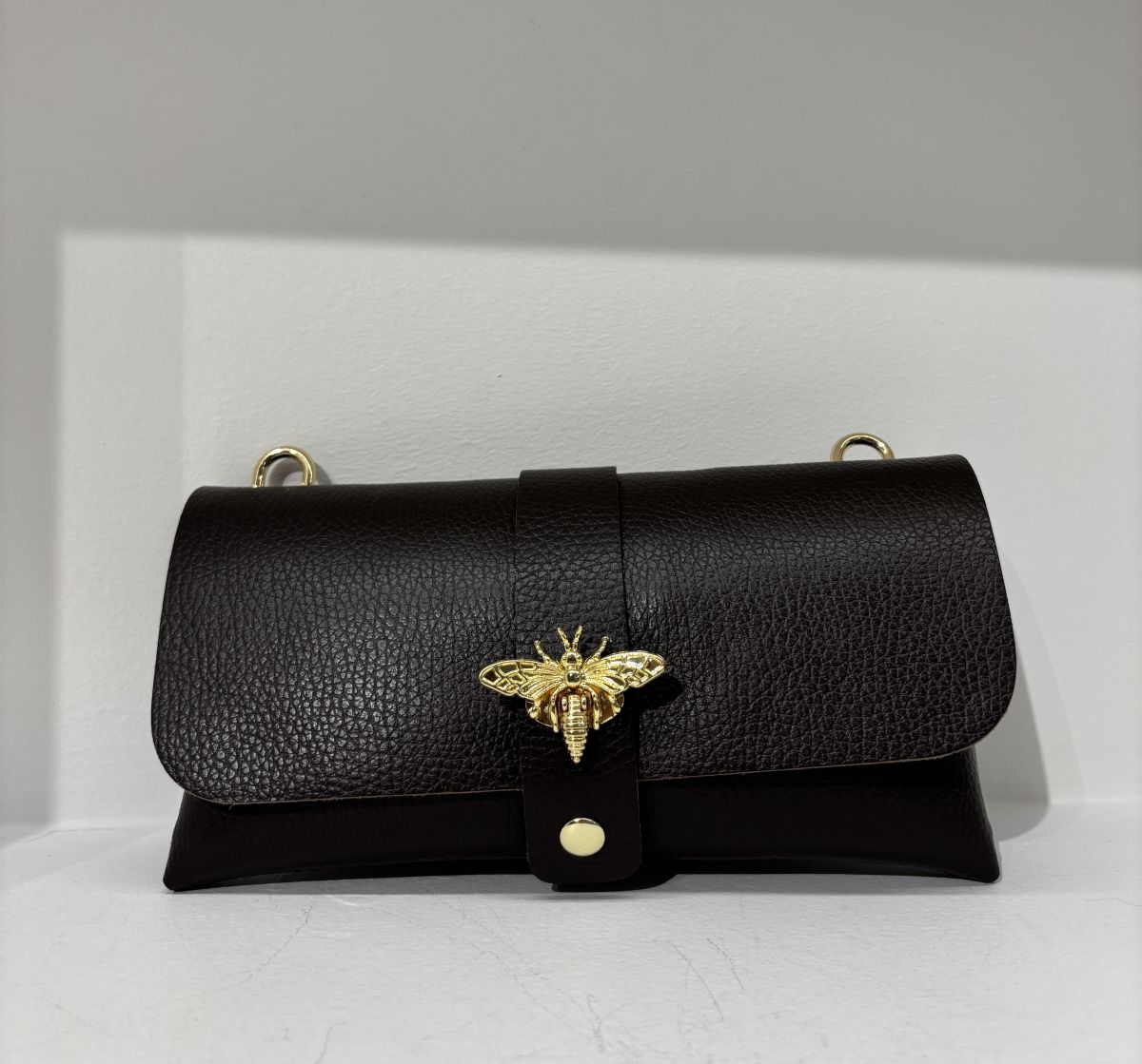 Pochette in vera pelle con tracolla interna rimovibile, presenta vari inserti dorati e originale chiusura a forma di ape la cui coda funge da pratica leva per aprire con un gesto elegante la borsa.